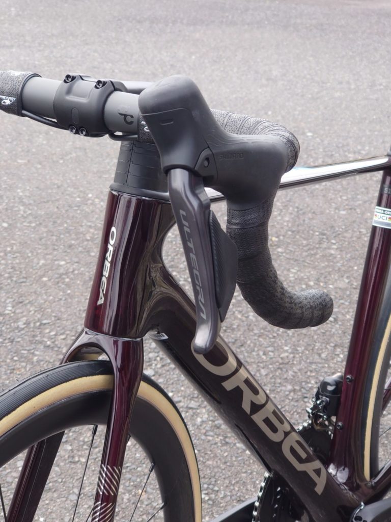 ワイヤーを完全内装し、エアロに配慮したヘッドセット。大口径な1-1/2インチのヘッドサイズ+真円のフォークコラムは、特に剛性を重視するオルベアらしい選択ですね。
