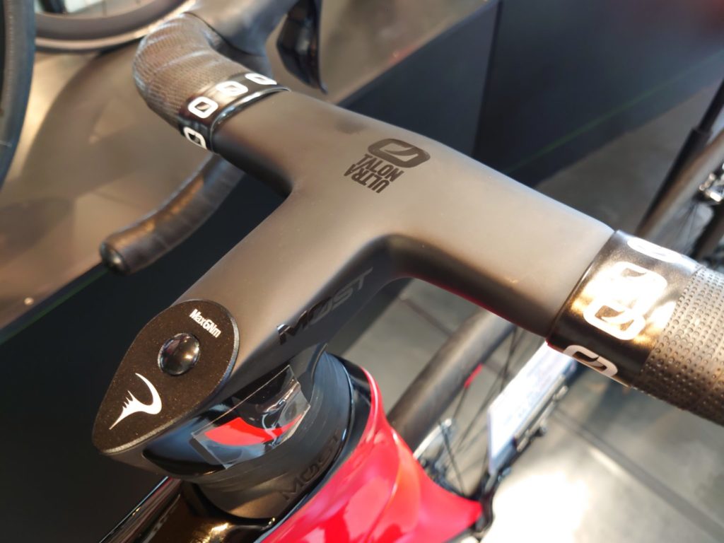 F7では一体型ハンドル「TALON ULTRA LIGHT」+「ULTEGRA Di2」を採用。このハンドルは非常に軽くて剛性もあり、空力、快適性にも優れるカーボン製です。